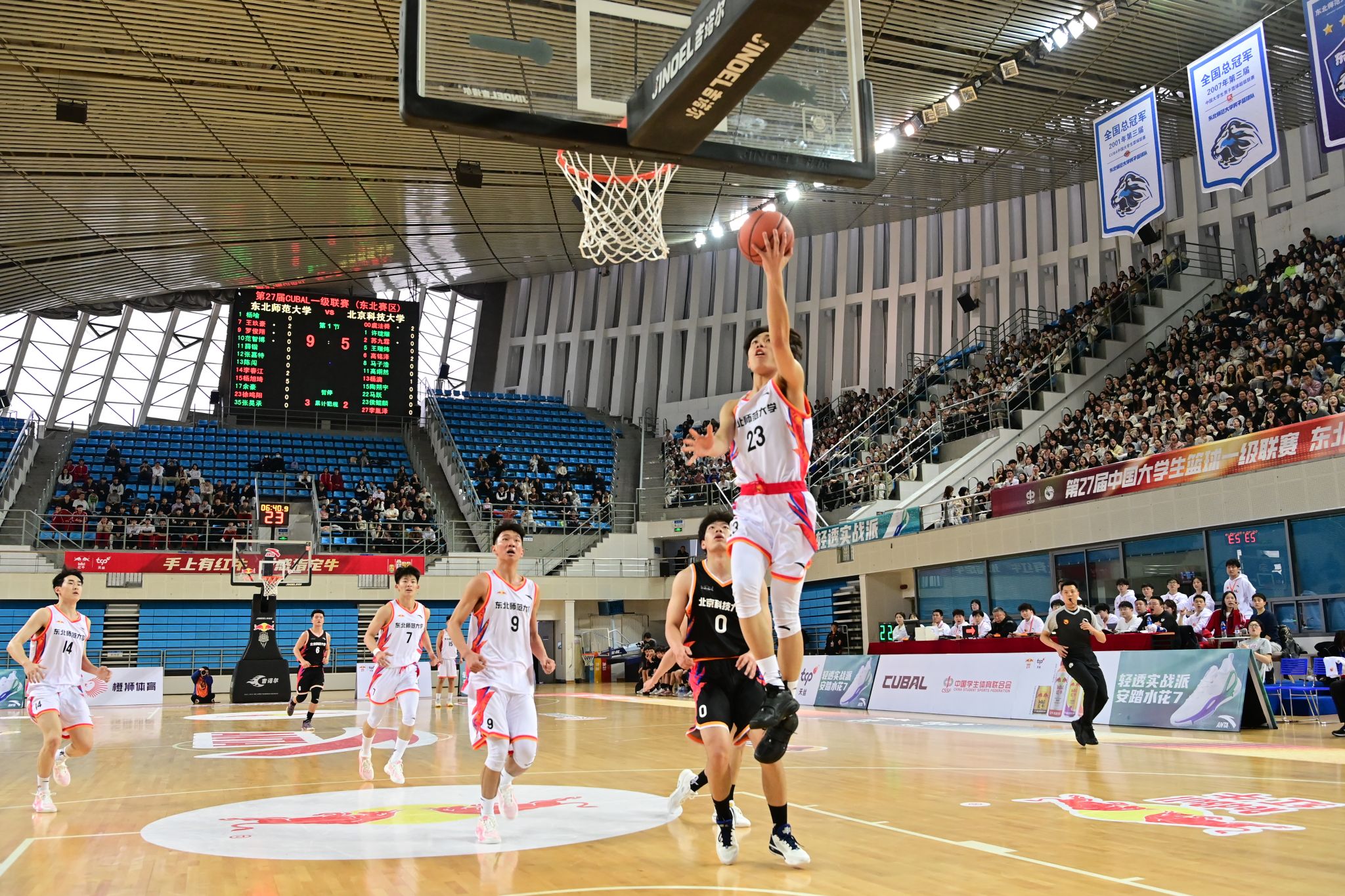比赛刚一开始,东师男篮杨旭琦投进三分球取得开门红,观众席瞬间被点燃,欢呼声震耳欲聋。随后,双方比分交替上升,异常胶着,东师男篮陈闯连得四分打进压哨球,使球队士气大振,在首节以3分暂时领先。次节回来,东师男篮凭借迅猛的突破和精准的远投迅速拉开比分,范智博采用欧洲步打进“2+1”,将比分拉开至10分。东师男篮火力全开,连续强势突破和钉板盖帽持续拉开比分,将比赛推向一波又一波高潮。半场战罢,东北师大以47:36领先北京科大。